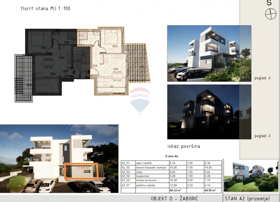 Stan A2 nalazi se u prizemlju novogradnje u Žaboriću. Stan površine 49.5 m2 u manjoj zgradi s ukupno 6 stanova sastoji se od kuhinje spojene s blagovaonicom i dnevnim boravkom, kupaonice, spavaće sobe i prostrane terase veličine 14.38 m2.
