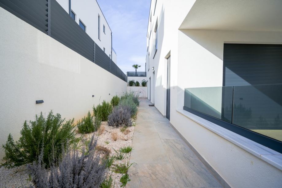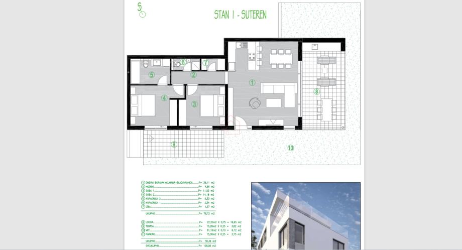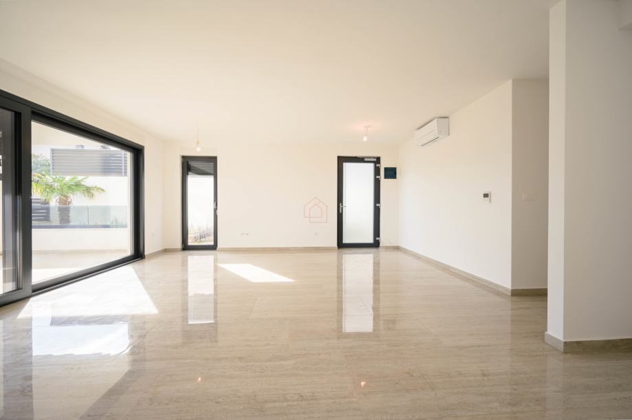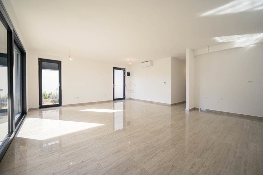 Prodaje se stan tipa 2,5-sobni (2S+DB) smješten u prizemlju moderne zgrade izgrađene 2023. godine, na atraktivnoj lokaciji u Murteru. S ukupnom površinom od 109,46 m², ovaj stan nudi savršen spoj suvremenog dizajna i funkcionalnosti.