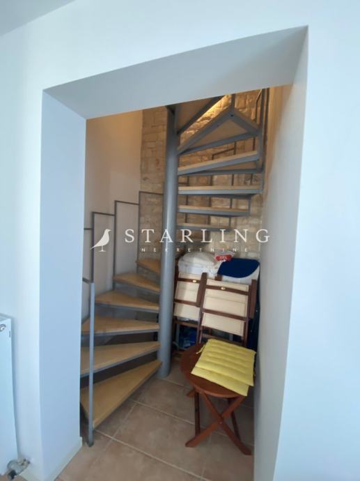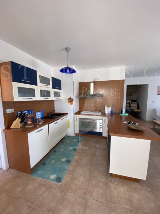 Dvoetažni je stan na prvo etaži nalazi se kuhinja, blagovaona, kupatilo, vešeraj, dnevni boravak s izlaskom na balkon na kojem se nalazi ugrađeni roštilj.