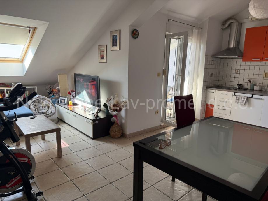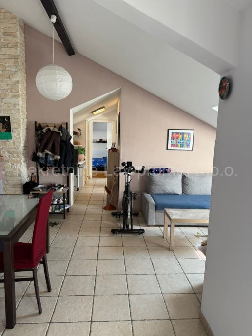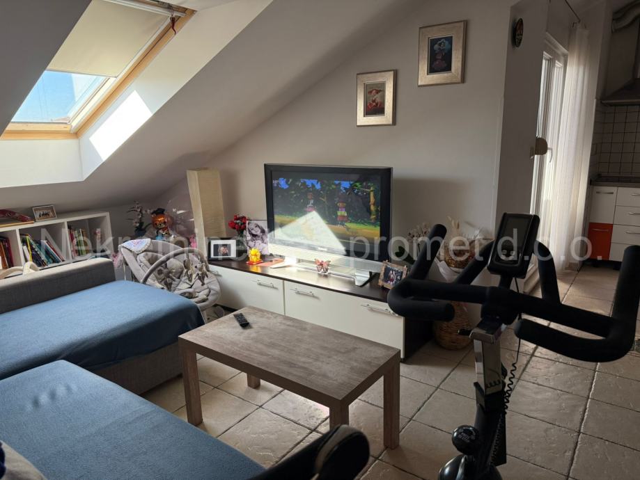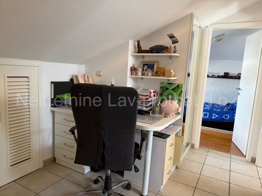 Potkrovlje daje stanu poseban šarm, toplinu i obilje prirodnog svjetla. Kosine su pametno iskorištene kao dodatne spremišne zone, što prostoru dodaje funkcionalnost i osjećaj prostranosti.