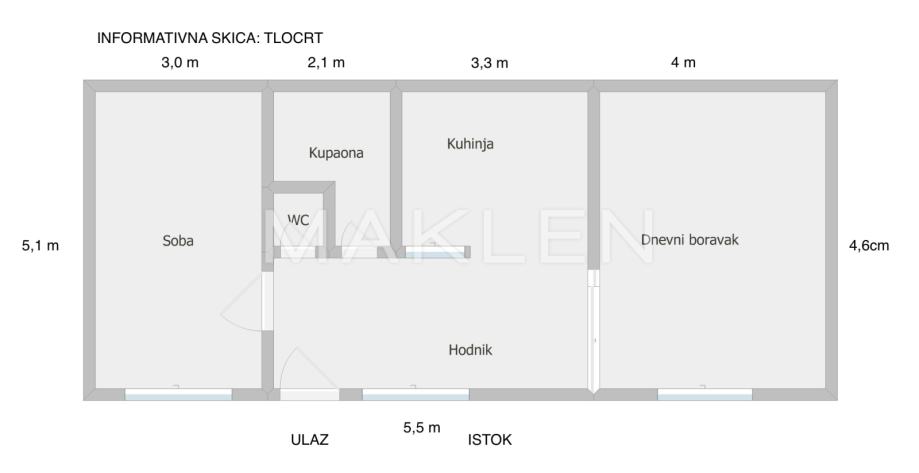 Stan se sastoji od dnevnog boravka, kuhinje s blagovaonicom, spavaće sobe, kupaone, zasebnog wca te hodnika.