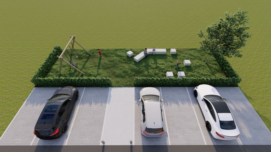 6 parkirnih mjesta je ispred zgrade, dok je iza zgrade 14 parkirnih mjesta i uređeno dvorište koje će sadržavati malo dječje igralište i roštilj, te će biti dostupno na korištenje svim stanarima.