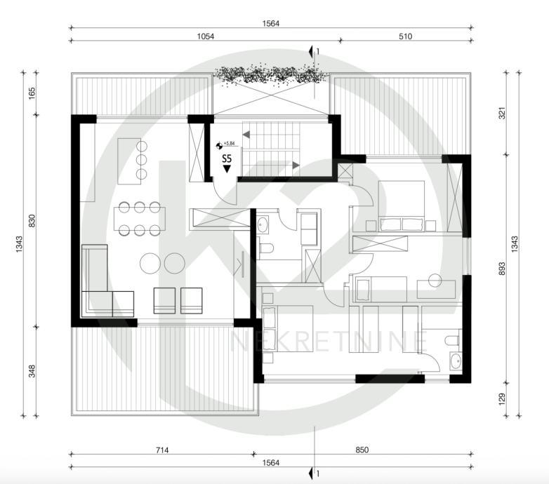 Predmetni stan penthouse oznake S5 se nalazi na drugom katu te se sastoji od ulaznog prostora, kupaonice sa WC-om, tri spavaće sobe od kojih jedna ima vlastitu garderobu i kupaonicu, dnevnog boravka sa kuhinjom i blagovaonicom te izlazom na dvije terase.