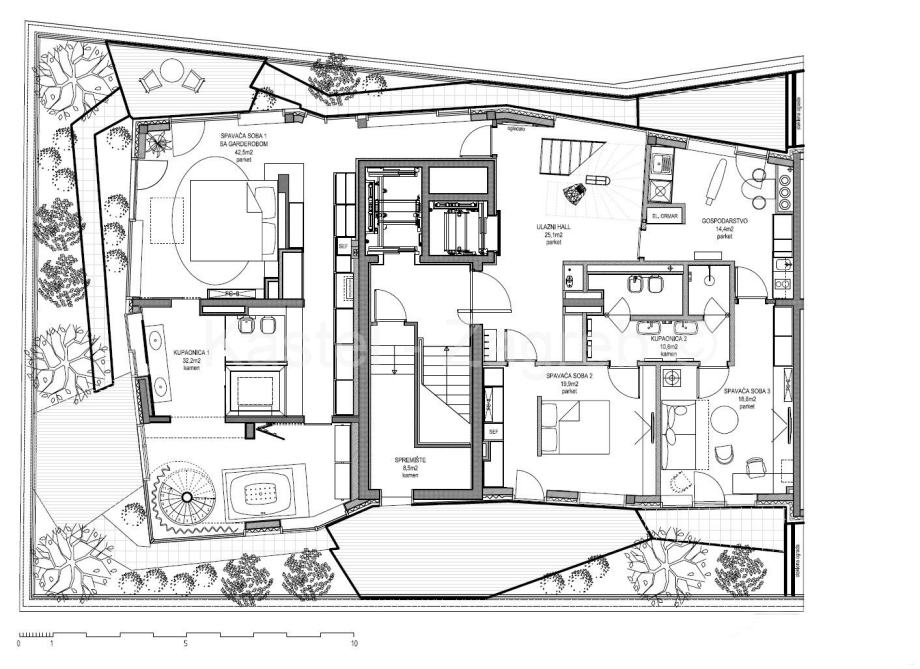 Stanu se pristupa vlastitim dizalom na obje etaže, pripada mu spremište, garaža za 3 automobila, te terase i uređeni vrtovi od cca 300m2.