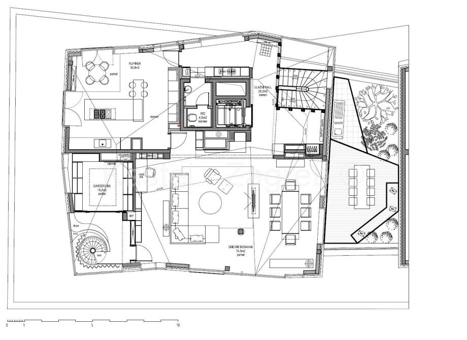 Gornja etaža je osmišljena kaodnevni prostor sa dnevnim boravkom , profesionalnom kuhinjom i gostinjskim wc-om. Biblioteka je napravljena po mjeri. Iz dnevnog dijela izlazi se na terasu za druženja sa zimskim vrtom i pogledom na katedralu i grad.