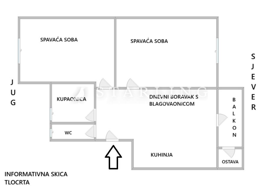 Stan se sastoji od dnevnog boravka s blagovaonicom, kuhinje, dvije spavaće sobe, kupaonice, wc-a, balkona te ulaznog hodnika. Stan se prodaje namješten. U zgradi se nalazi i spremište koje je zajednički prostor stanara. Stanu pripada garažno parkirno mjesto koje nije upisano u vlasnički list.