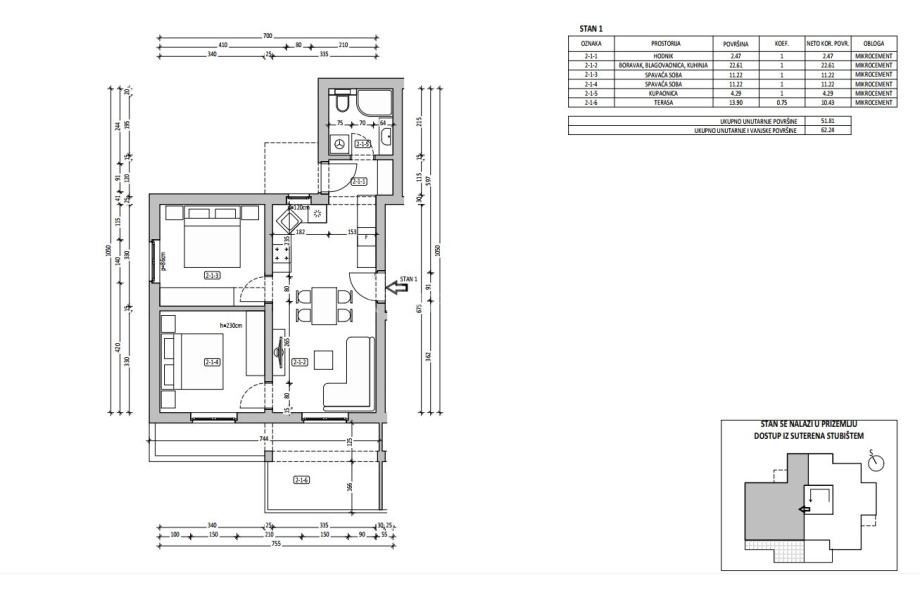 Stan se nalazi u prizemlju zgrade i ima 62,24 m2. Sastoji se od dnevnog boravka s blagovaonicom s izlaskom na terasu, kupaonice, dvije spavaće sobe od kojih jedna ima izlaz na terasu.