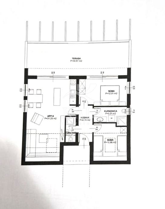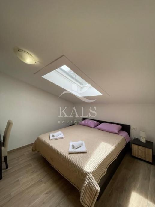 Stan se nalazi u potkrovlju stambene zgrade i može se iskoristiti kao 2 stambene jedinice s obzirom da ima 2 ulaza, 2 ulazna hodnika, 2 spavaće sobe, 2 dnevna prostora (kuhinje povezane s blagovaonicom i dnevnim boravkom koji ima izlaz na nenatkrivenu terasu) , 2 kupaonice, 2 lođe.