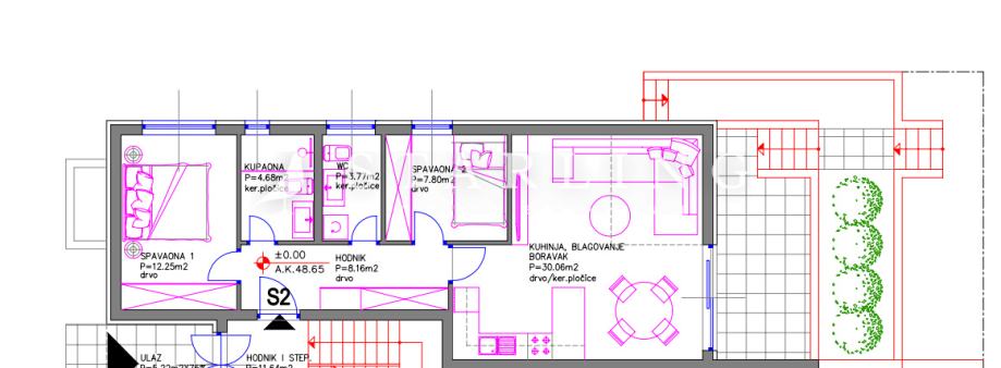 Stan se sastoji od ulaznog hodnika, otvorenog open space prostora koji se sastoji od gostinjskog toaleta, dnevnog boravka s kuhinjskim i blagovaonskim dijelom, dvije komforne spavaće sobe i kupaonice s walk-in tušem, te natkrivene terase. Posebnost ovog stana je pripadajući vrt 90 m2 u kojem možete uživati s najbližima.