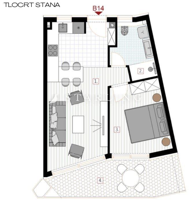 Stan se sastoji od ulaznog hodnika s garderobom, kupaonice. dnevnog boravka s kuhinjskim i blagovaonskim dijelom, spavaće sobe, te lođe.