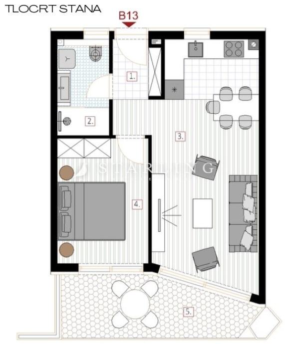 Stan se sastoji od ulaznog hodnika s garderobom, kupaonice. dnevnog boravka s kuhinjskim i blagovaonskim dijelom, spavaće sobe, te lođe.