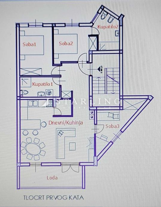 Stan se sastoji od tri spavaće sobe, dva kupatila, dnevnog boravka, kuhinje, lođe.