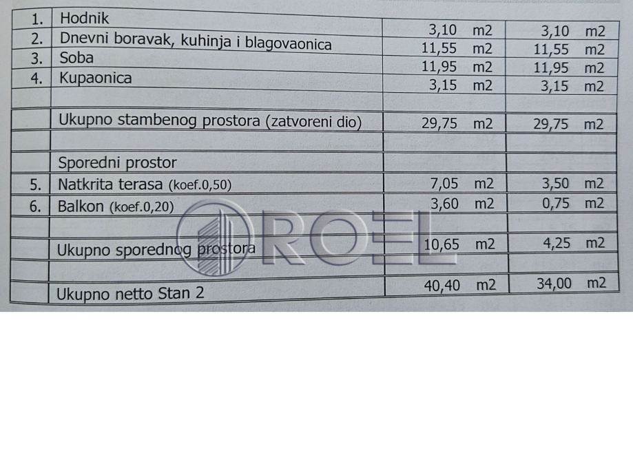 Stan se sastoji od terase, ulaznog hodnika, dnevne sobe s kuhinjom i blagovaonom, kupaone i prostrane spavaće sobe. S terase se pruža predivan otvoreni pogled na more.