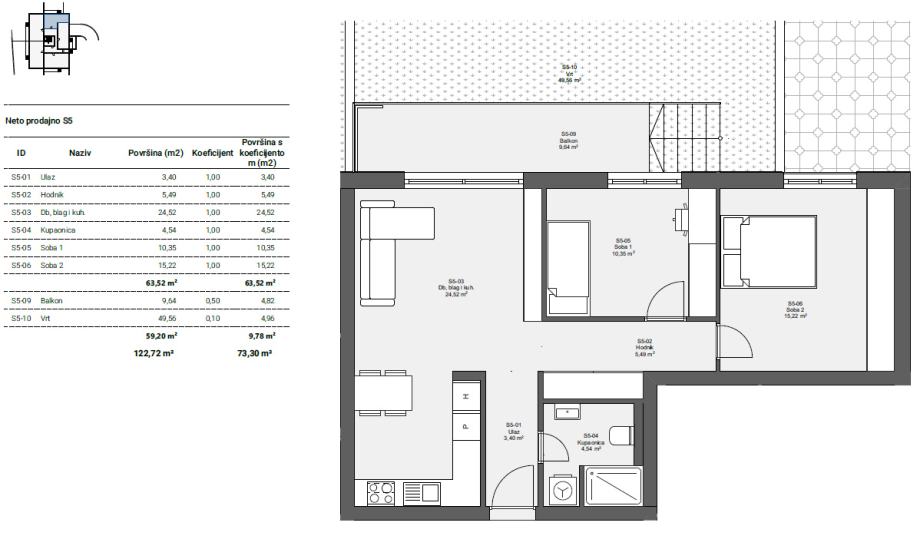s WC-om, dvije prostrane spavaće sobe, balkona od 9,64 m2 i vrta površine 49,56 m2.