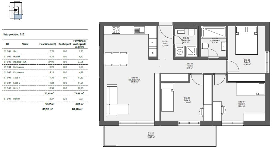 kupaonice s WC-om, tri prostrane spavaće sobe, te balkona površine 12,27 m2.