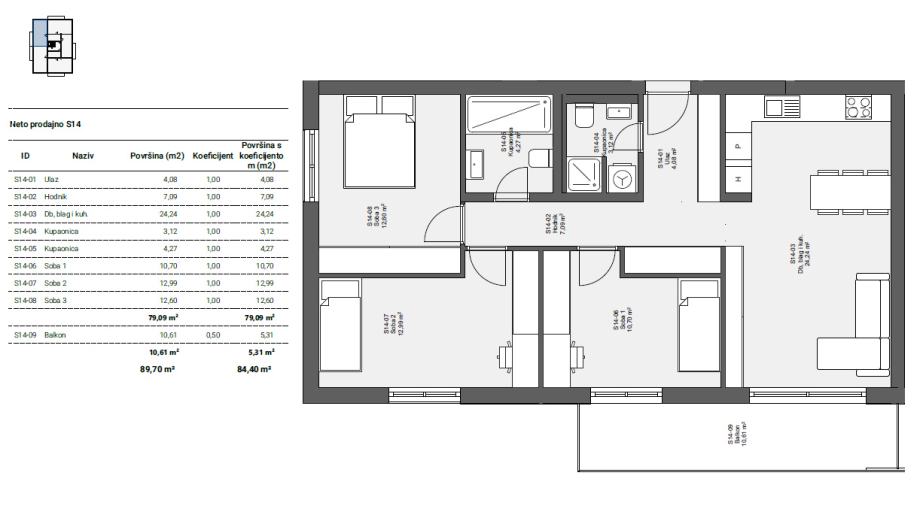 kupaonice s WC-om, tri prostrane spavaće sobe, te balkona površine 10,61 m2.