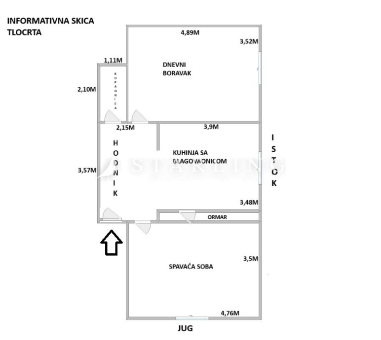Stan se sastoji od dnevnog boravka, kuhinje i blagovaonice, spavaće sobe, kupaonice s wc-om, smočnice, walk-in ormara i ulaznog hodnika.