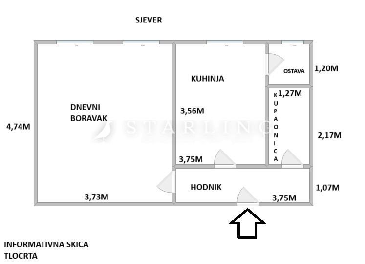Stan se sastoji od dnevnog boravka, kuhinje, kupaonice s wc-om, ostave i ulaznog hodnika.