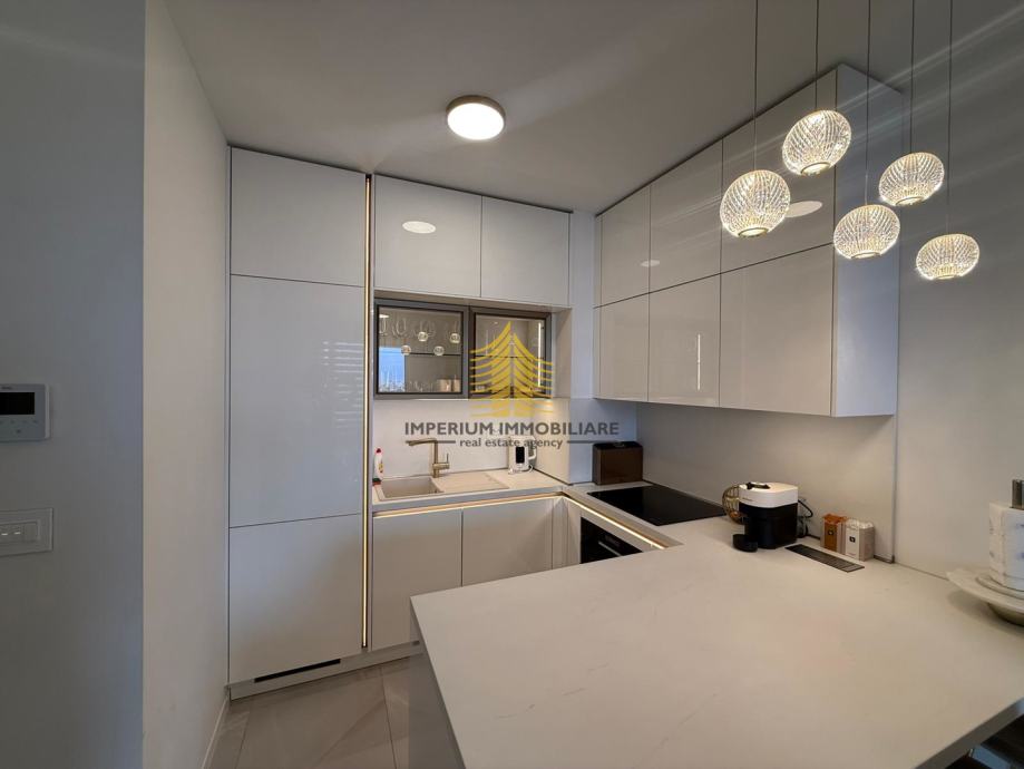 Stan se ističe svojom dizajnerskom uređenosti te obiljem prirodnog svjetla, zahvaljujući vrlo sunčanoj jugozapadnoj orijentaciji. Prostrani balkon površine 6 m2 pruža lijep pogled, uključujući i pogled na more, što dodatno doprinosi osjećaju ugode i privatnosti. Raspored s jednom spavaćom sobom čini ga idealnim izborom za samce, parove ili kao investicijsku priliku.