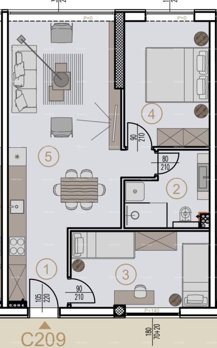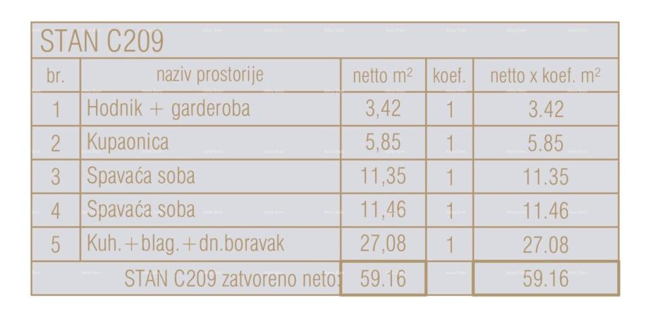 Stan C209, nalazi se na drugom katu centralne zgrade i sastoji se od: hodnika + garderobe, dnevnog boravaka, sa kuhinjom i blagovaonicom, 2 spavaće sobe i kupaonice.