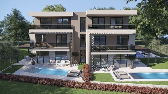 U Taru nedaleko Poreča prodaje se luksuzan dvoetažni stan u novogradnji,od 157.64 m². sa parkingomi spremištem, ukupno 181.47 m2 Stan se nalazi u prizemlju i na prvom katu stambene zgrade.Prva etaža smještena je u prizemlju zgrade koji se sastoji od predsoblja, dnevnog boravka, kuhinje i blagovaone sa izlazom na natkrivenu terasu , spavaću sobu sa kupaonicom i praonicu sa toaletom. Unutarnjim stepeništem pristupa se gornjoj etaži stana, ujedno i prvom katu zgrade gdje se nalaze dvije spavaće sobe svaka sa vlastitom kupaonicom i izlazom na terasu , s koje se pruža pogled na more.