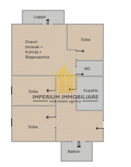 Stan se sastoji od ulaznog hodnika, kuhinje s blagavaonicom, dnevnog boravka, WC-a, kupaonice i tri spavaće sobe, što ga čini idealnim izborom za obitelji ili one koji traže dodatni prostor za rad ili hobije. Izuzetna prednost su balkon i lođa, koji pružaju mogućnost opuštanja na otvorenom. Prostor obiluje prirodnim svjetlom zahvaljujući vrlo sunčanoj poziciji.