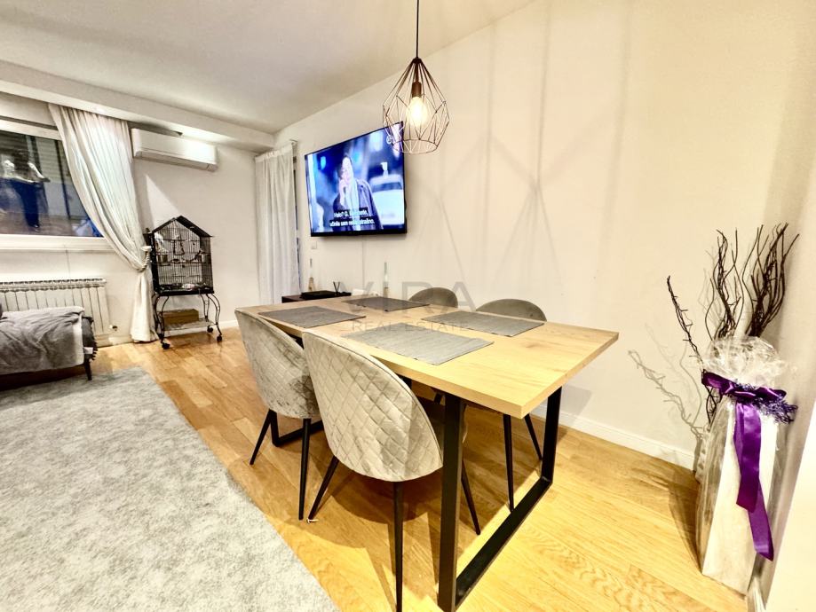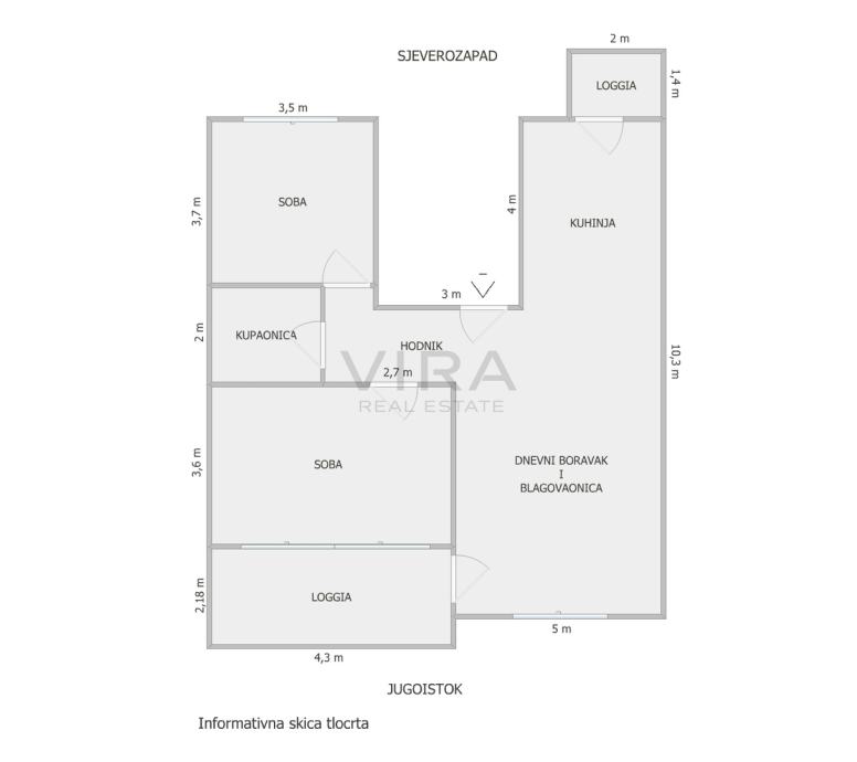 Stan se sastoji od dnevnog boravka, kuhinje, blagovaonice, 2 spavaće sobe, hodnika, kupaonice te 2 loggie.