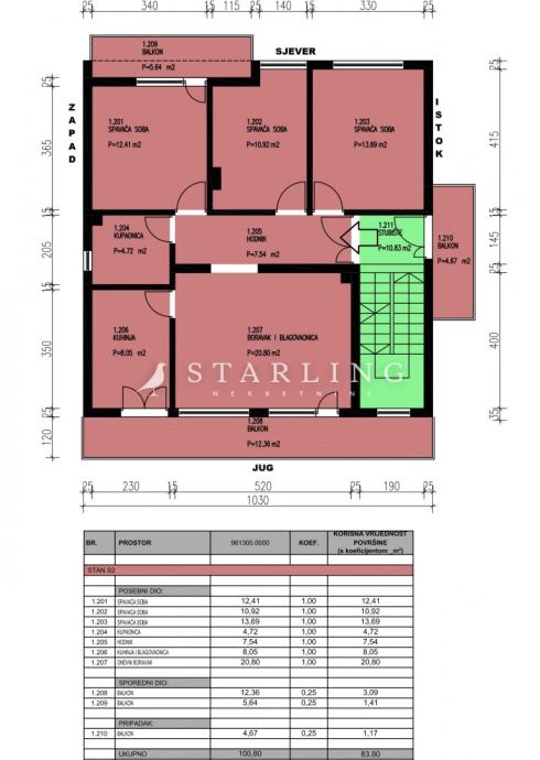 Zatvorena površina stana iznosi 78 m2. Ukupna obračunata neto kvadratura s balkonima i spremištem iznosi 87 m2.