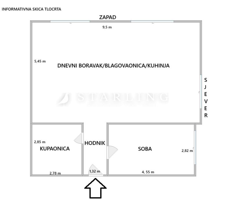 Stan se sastoji od dnevnog boravka i kuhinje, sobe, kupaonice i ulaznog prostora. Uz minimalne zahvate stan se može pretvorit u trosoban.