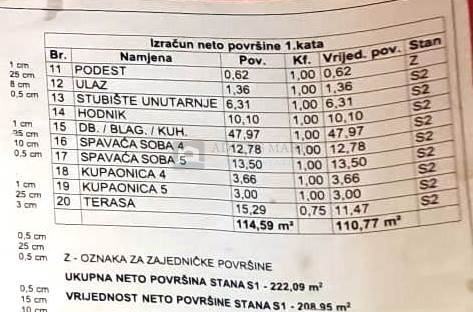 Neto površina stana prema glavnom projektu 208,95 m2 (detaljan iskaz svih površina u tlocrtima).