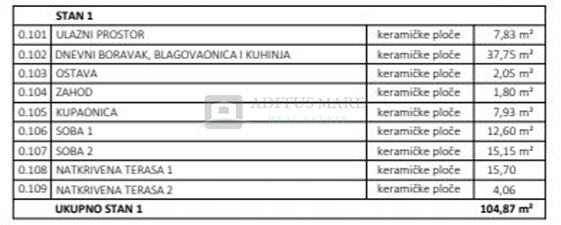 Ukupna neto površina stana iznosi 109,86 m², uz pripadajuće parkirno mjesto (22 m²) i privatni vrt površine 65 m².