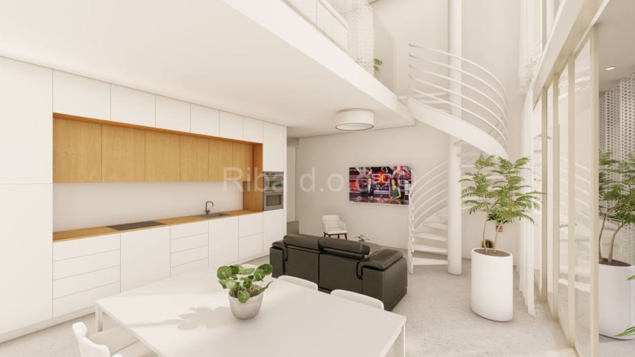 Stan je funkcionalno podijeljen na dvije etaže, s jasno odvojenim dnevnim i spavaćim zonama.