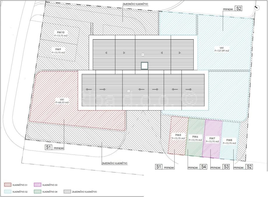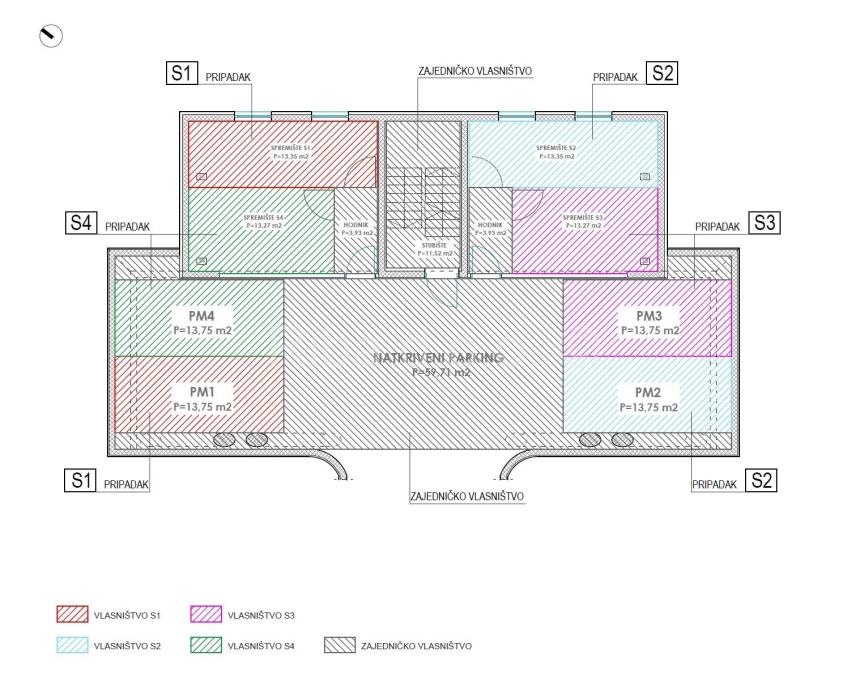Nekretnini pripadaju i garažno parkirno mjesto, vanjsko parkirno mjesto na otvorenom te spremišteu podrumu zgrade.