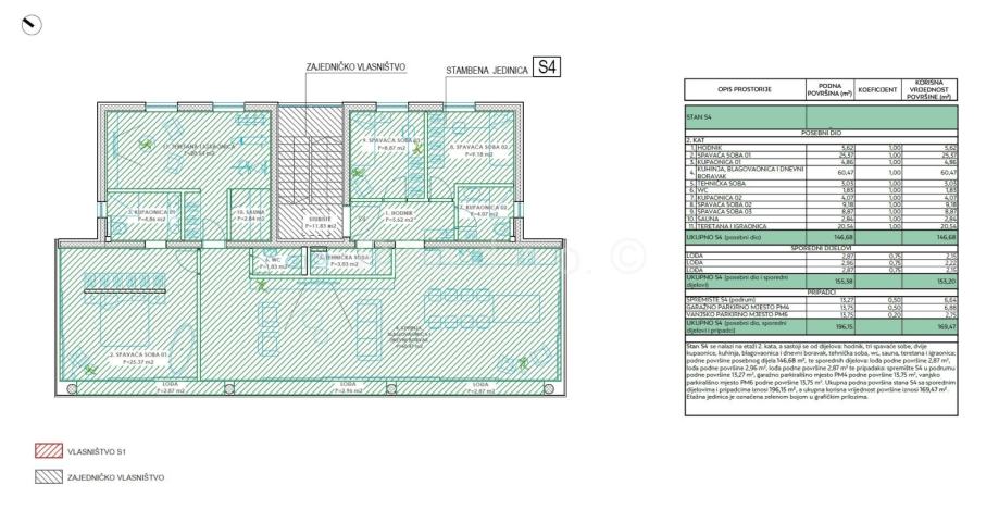 Ukupna površina stana s pripadcima je 169,47 m2.