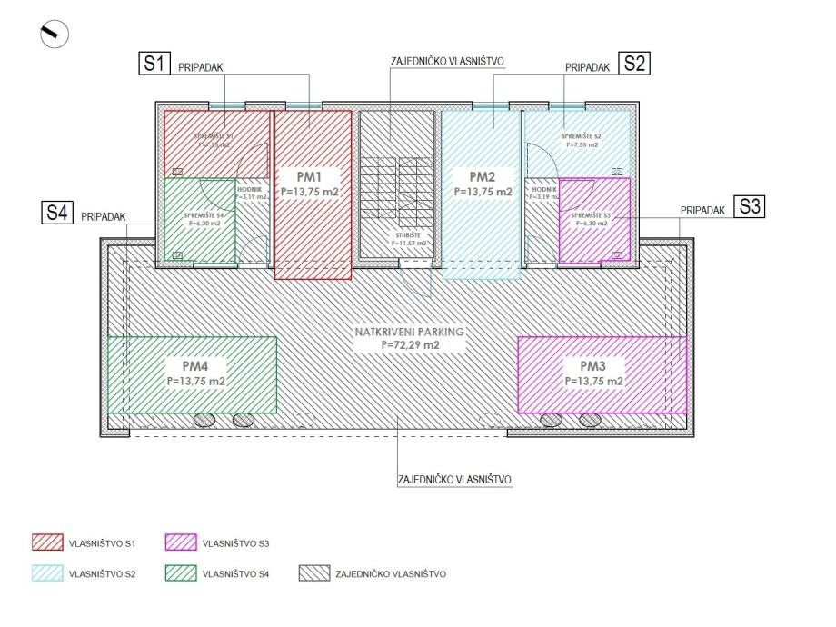 Nekretnini pripadaju i garažno parkirno mjesto, vanjsko parkirno mjesto na otvorenom te spremište u podrumu zgrade.