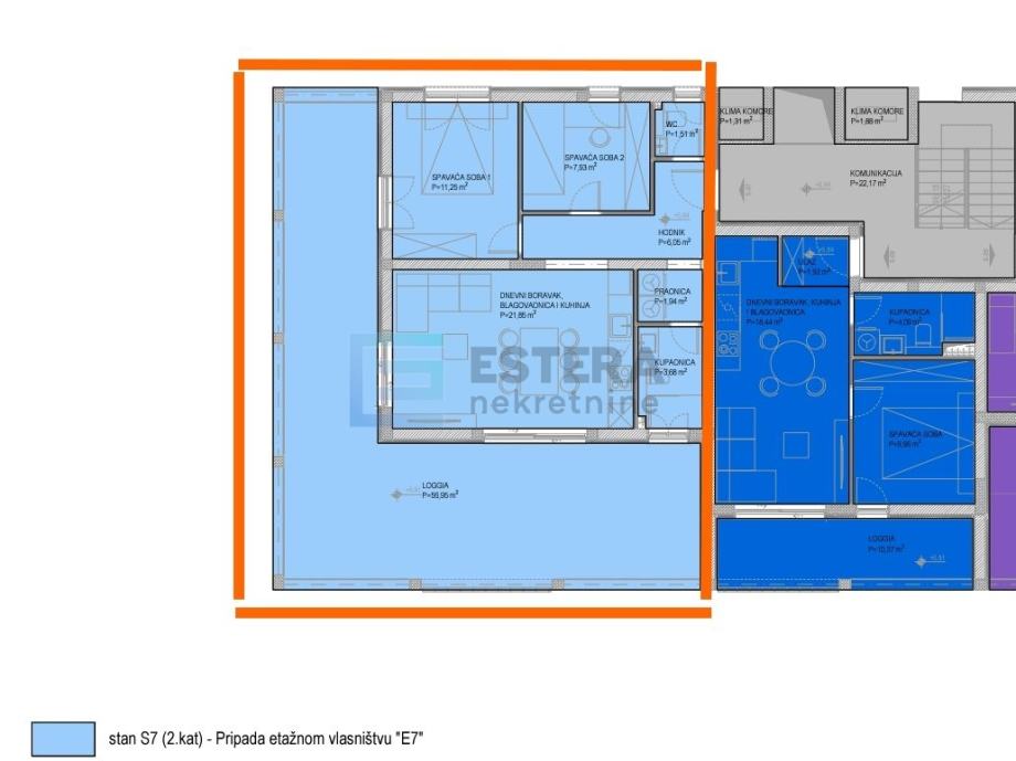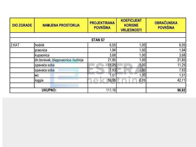 Ukupna neto korisna površina stana (NKP) je 103,17 m2. Po etažnom elaboratu 96,92 + 2 parkirna mjesta (12,5 m2 x 2=25 m2 x 0,25= 6,25 m2) daje ukupnih 103,17 m2 NKP ili 2.617€ po m2. Nekretninu je moguće kupiti kreditom, a za gotovinsku uplatu se može ugvoriti određeni popust. Predviđeno vrijeme završetka gradnje je u trećem mjesecu 2025.
