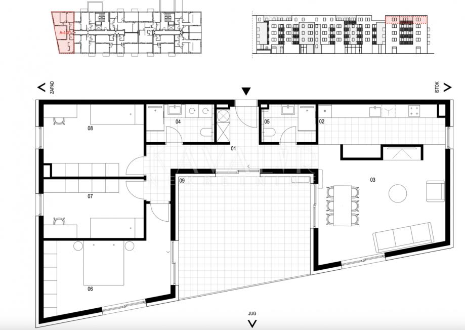 Stan se sastoji od dnevnog boravka s kuhinjom i blagovaonicom, tri spavaće sobe, dvije kupaonice s wc-om, hodnika te loggie.