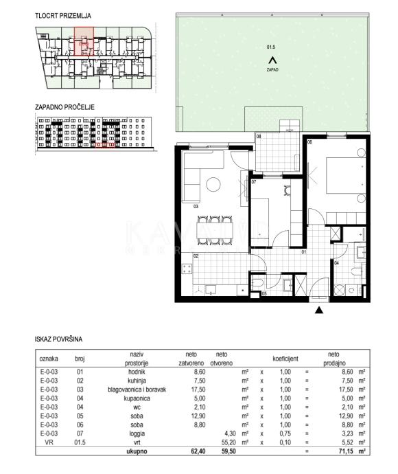 Stan se sastoji od dnevnog boravka s kuhinjom i blagovaonicom, spavaće sobe, kupaonice s wc-om, hodnika, loggie te vrta.