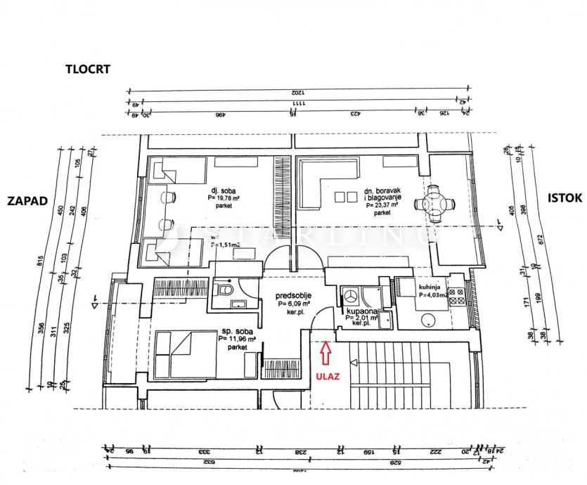 Stan se sastoji od dnevnog boravka s blagovaonicom, kuhinje, 2 sobe, kupaonice, odvojenog wc-a i hodnika.