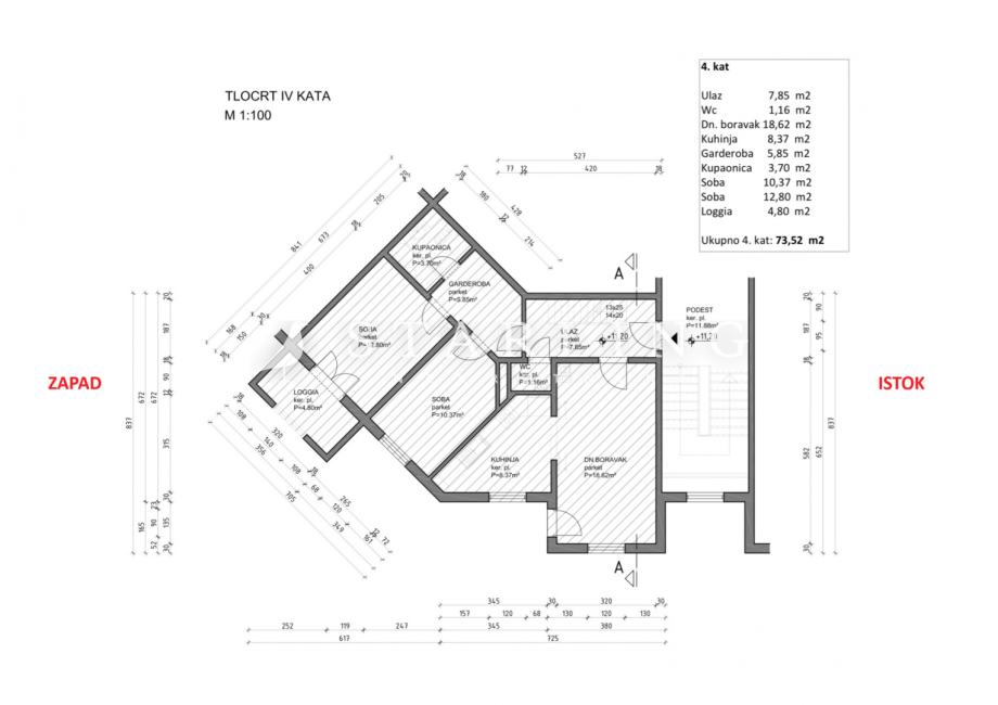 1. etaža (74 m²): prostrani dnevni boravak s kuhinjom i blagovaonicom, dvije spavaće sobe, kupaonica, vešeraj (perilica i sušilica) te lođa