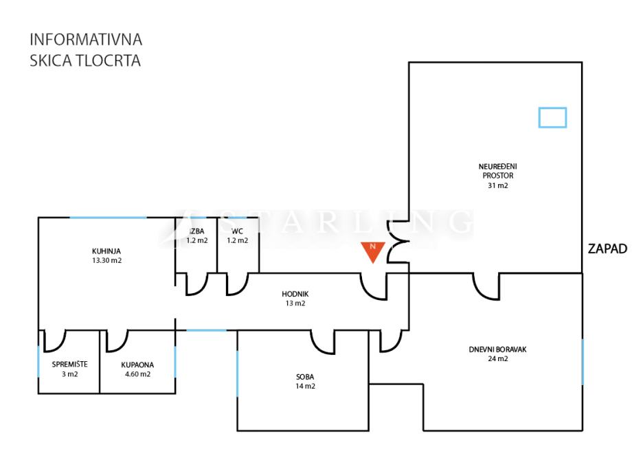 i prostorije u nastavku dnevnog boravka u neuređenom stanju od 35 m2.