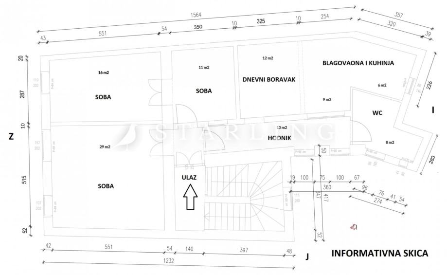 Stan se sastoji od dnevnog boravka, blagovaonice i kuhinje, tri spavaće sobe, kupaonice s wc-om i hodnika.