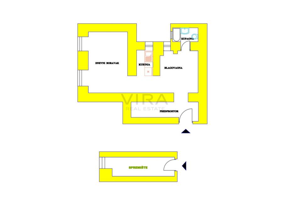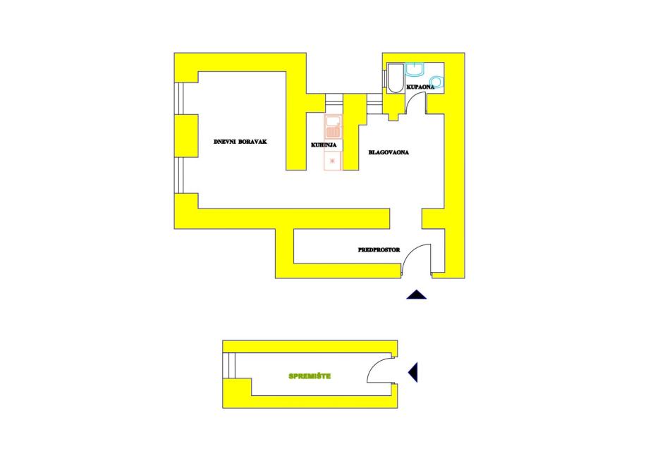 Stan se sastoji od dnevnog boravka i blagovaonice, kuhinje, hodnika, kupaonice s wc-om i spremišta.
