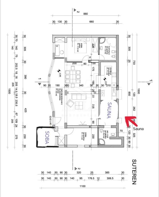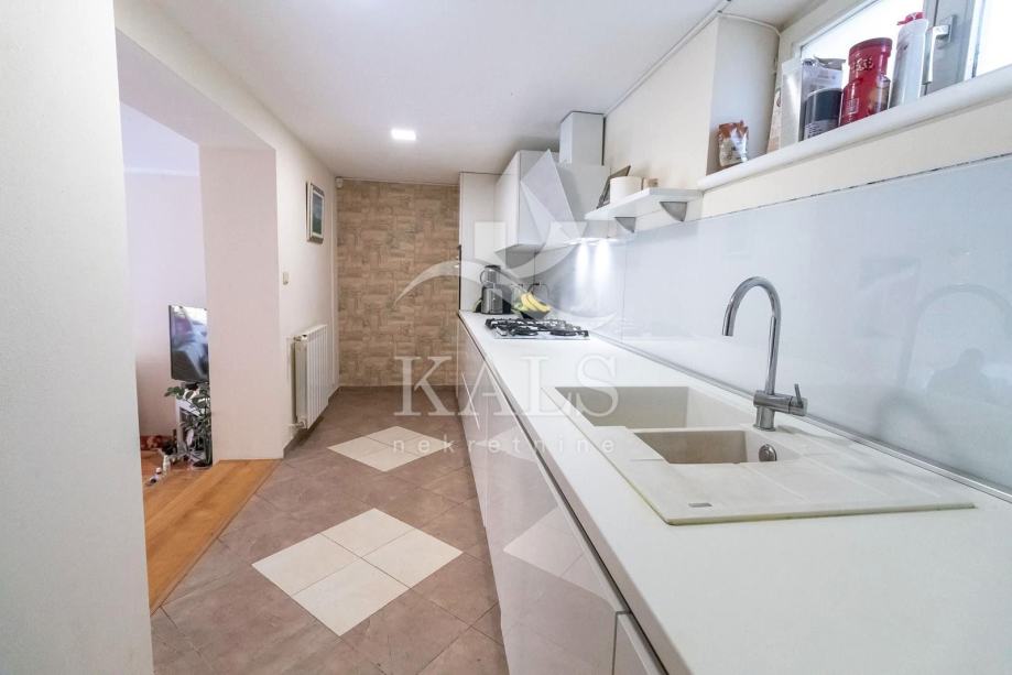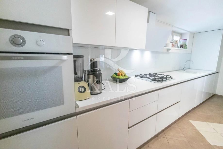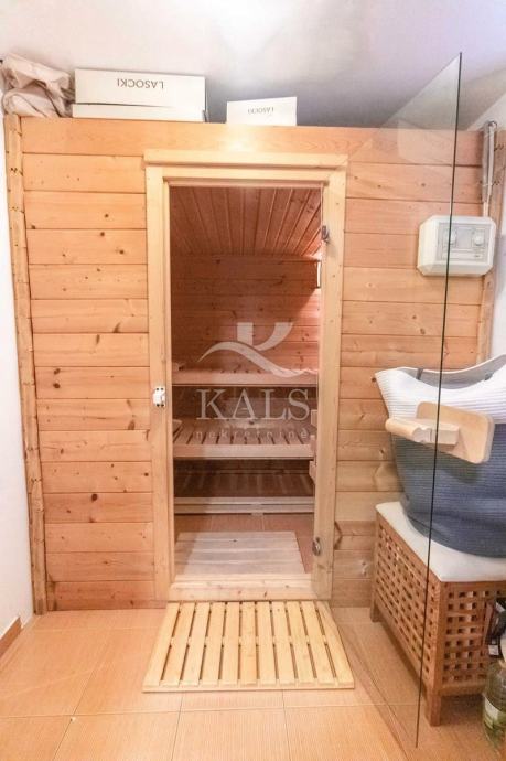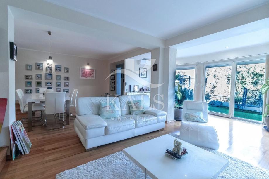 Stan se sastoji od velikog open space dnevnog boravka, prostrane kuhinje s blagovaonicom, tri spavaće sobe, dvije kupaone sa WC-om, finske saune, hodnika i velikog vrta.