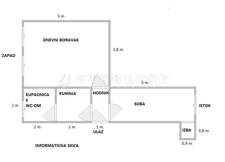 Stan se sastoji od dnevnog boravka, kuhinje, blagovaonice, spavaće sobe, kupaonice s wc-om i hodnika.