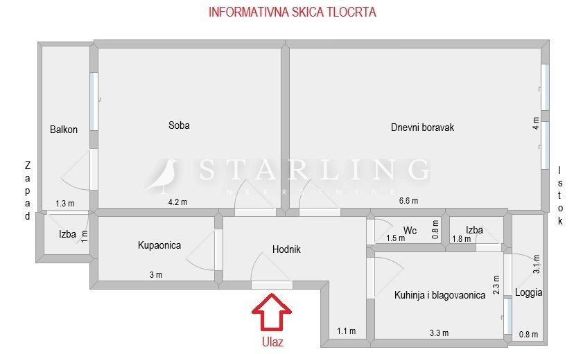 Stan se sastoji od dnevnog boravka, kuhinje i blagovaonice, spavaće sobe, kupaonice, wc-a, balkona s izbom, loggie, izbe i hodnika.