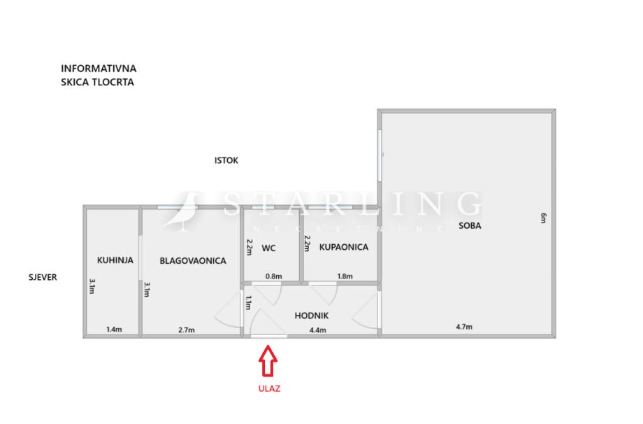 Stan se sastoji od dnevnog boravka, kuhinje, blagovaonice, spavaće sobe, kupaonice, wc-a i hodnika.