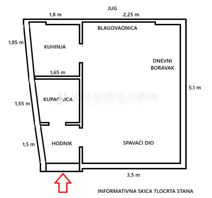 Stan se sastoji od prostorije u kojoj se nalazi spavaći dio s dnevni boravkom i blagovaonicom, kuhinje, kupaonice s WC-om i hodnika.