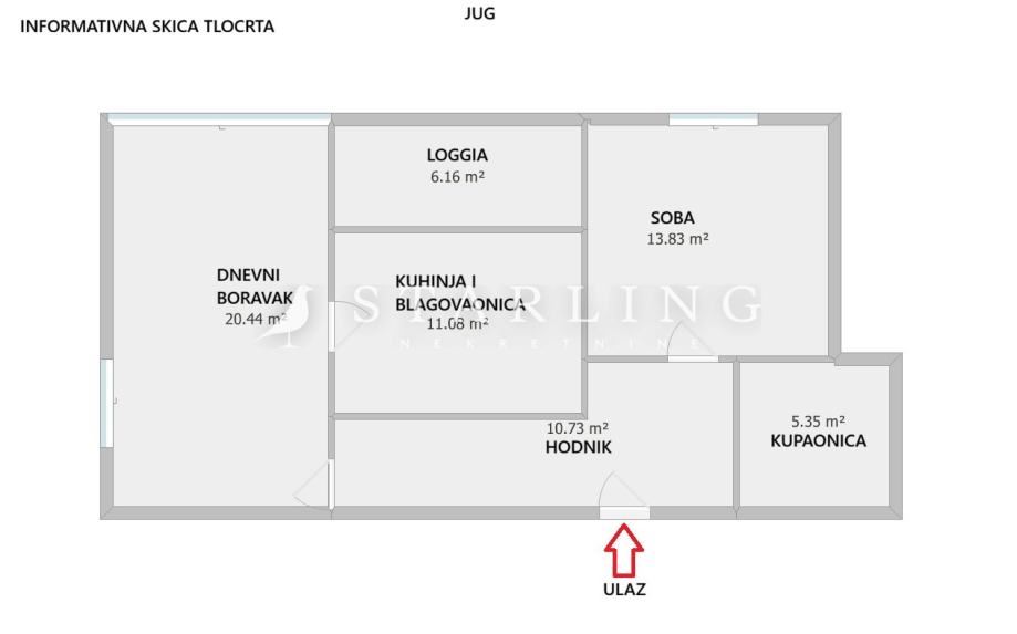 Stan se sastoji od dnevnog boravka, kuhinje s blagovaonicom, spavaće sobe, kupaonice s WC-om, loggie i hodnika.