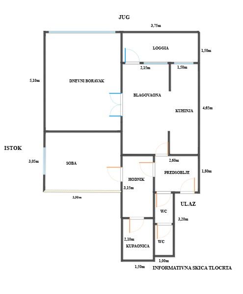 Stan se sastoji od dnevnog boravka, kuhinje i blagovaonice, spavaće sobe, hodnika, predsoblja, kupaonice, wc-a te loggie.